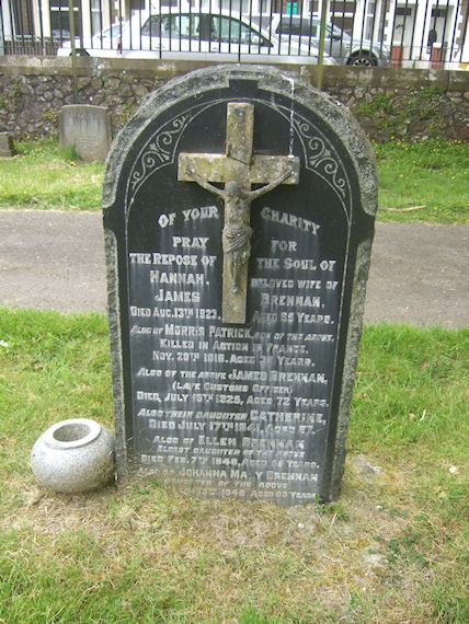 | R3328 | Private | Brennan | Of your Charity pray for the Repose of the soul of HANNAH, beloved wife of James BRENNAN. Died 13 August 1923, aged 85 years. Also of MORRIS PATRICK, son of the above, Killed in Action in France 20 November 1916, aged 30 years. Also of the above JAMES BRENNAN (Late Customs Officer) died 19 July 1925, aged 72 years. Also their daughter CATHERINE died 17 July 1941, aged 57. Also of ELLEN BRENNAN eldest daughter of the above, died 7 February 1948, aged 65 years. Also of JOHANNA MARY BRENNAN daughter of the above 13 March 1948 aged 53 years. | 1923 |