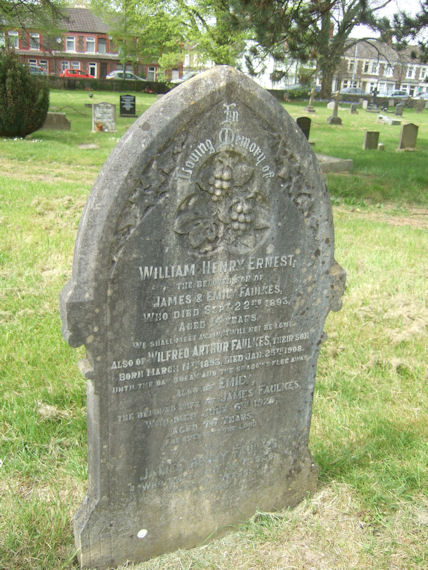 | S415 | Private | Faulkes | In Loving Memory of WILLIAM HENRY ERNEST, the beloved son of James & Emily FAULKES, who died 22 September 1893, aged 14 years. We shall meet again, 'twill not be long. Also of WILFRED ARTHUR FAULKES, their son, born 11 March 1893, died 25 January 1908. Until the day break and the shadows flee away. Also of EMILY, the beloved wife of James FAULKES, who died 6 June 1925, aged 70 years. For ever with the Lord. Also JAMES HENRY FAULKES, who died 20 January 1936, aged 82 years. Reunited. | 1893 |