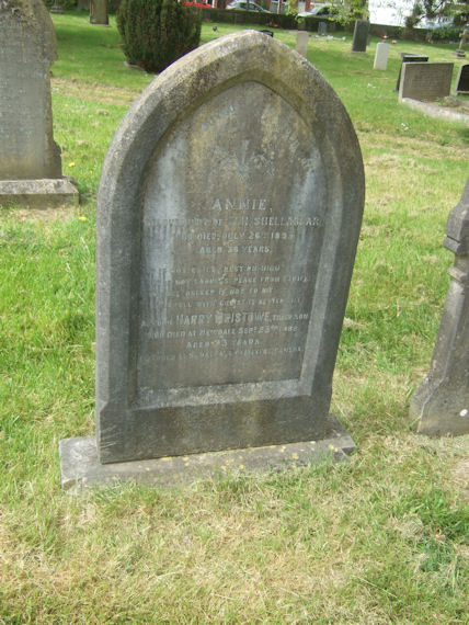 | S439 | Private | Shellabear | In Loving Memory of ANNIE beloved wife of W H SHELLABEAR, who died 26 July 1893, aged 36 years. It is not exile, rest on high, it is not sadness, peace from Strife, to all asleep is not to die. To dwell with Christ is better life. Also of HARRY BRISTOWE, their son, who died at Newdale 23 September 1892, aged 23 years. Interred at Shoal Lake Cemetery, Canada. | 1893 |