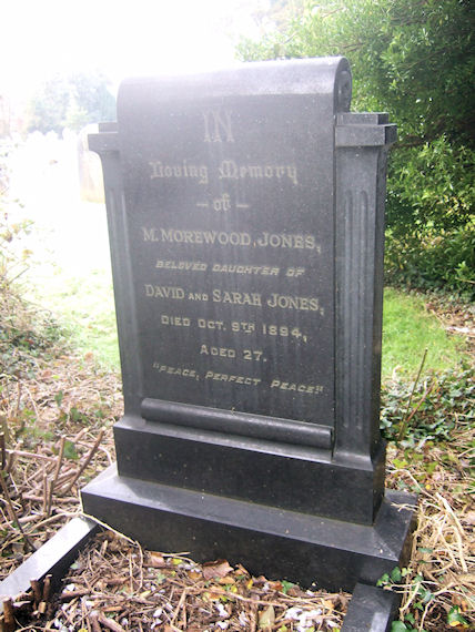 | S93 | Private | Jones | In Loving Memory of M MOREWOOD JONES, beloved daughter of David and Sarah Jones, died 9 October 1894, aged 27. "Peace, Perfect, Peace" | 1894 |