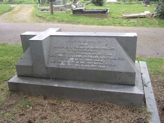 | I1057/I1065 | Private | Phillips | In Loving Memory of ANNIE, beloved wife of Thomas Richards PHILLIPS, 45 Park Place, Cardiff, who died 7 July 1923, in her 61st year. Also of THOMAS LLEWELLYN PHILLIPS, Capt 5th Welsh Regt, elder son of the above named, who lost his life at the First Battle of Gaza, 26 March 1917, in his 23rd year. Also the aforesaid THOMAS RICHARDS PHILLIPS, who died 24 January 1941, in his 84th year. Also of DAVID EVAN LLEWELLYN PHILLIPS, younger son of the above named, who died 22 January 1974, in his 73rd year. | 1923 |