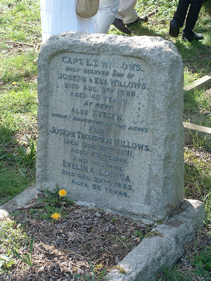 | I311 | Private | Willows | Capt E T WILLOWS, only beloved son of Joseph & Eva Willows, died 3 August 1926, aged 40 years. At Rest. Also Evelyn, infant daughter of the above. Also JOSEPH THOMPSON WILLOWS died 19 October 1931, aged 73 years. And his wife EVELINA LOUISA died 29 December 1953, aged 96 years. | 1926 |