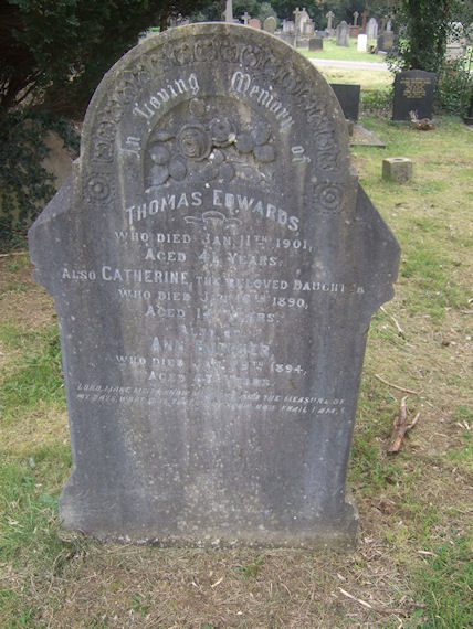 | I33 | Private | Edwards | In Loving Memory of THOMAS EDWARDS who died 11 January 1901, aged 41 years. Also CATHERINE, the beloved daughter, who died 16 January 1890, aged 14 years. Also ANN BUTCHER, who died 29 January 1894, aged 68 years. Lord make me to know mine end and the measure of my days, what it is that I may know. How frail I am. | 1901 |