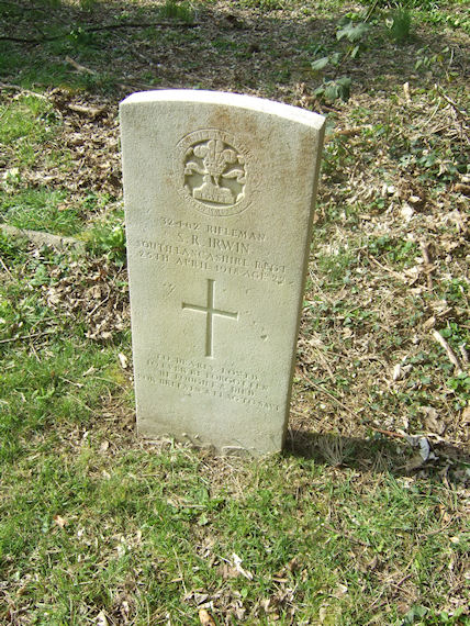 | I501 | CWGC | Irwin | 32462 Rifleman S R IRWIN South Lancashire Regt 25 April 1918 Age 22. To Dearly Loved to ever be forgotten, he fought & Died, for Britain's Flag to Save. | 1918 |