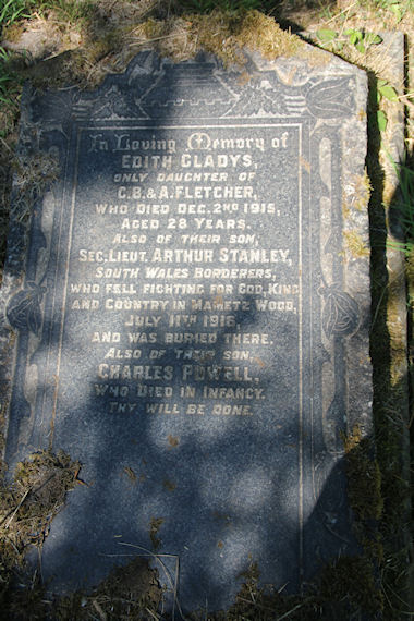 | I514 | Private | Fletcher | In Loving Memory of EDITH GLADYS, only daughter of C B & A FLETCHER, who died 2 December 1915, aged 28 years. Also of their son, Sec Lieut ARTHUR STANLEY, South Wales Borderers, who fell fighting for God, King and Country in Mametz Wood, 11 July 1916 and was buried there. Also of their son, CHARLES POWELL, who died in Infancy.Thy Will be Done. | 1915 |