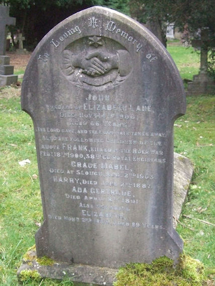 | I696 | Private | Lane | JOHN, husband of Elizabeth LANE, died 14 November 1906 age 66. Following children of above - FRANK, killed in the Boer War 18 February 1900, 38th Co Royal Engineers. GRACE MABEL died at Slough 2 August 1903. HARRY, died 2 June 1887. ADA GERTRUDE, died 8 April 1891. ELIZABETH, died 2 November 1932 age 89. | 1887 |