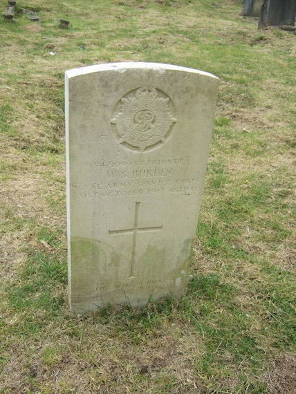 | I97 | CWGC | Burden | WILLIAM STEPHEN BURDEN died 31/10/1918. Age 41. Private Army Service Corps Res Supply Depot. Son of Stephen and Sarah Burden, of 13, Green St., Riverside, Cardiff; Husband of the Late Gertrude Burden. | 1918 |