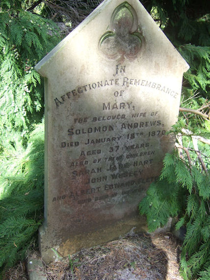 | Q351 | Private | Andrews | MARY, wife of Solomon ANDREWS, died 18 January 1870 age 37. Their children - SARAH JANE HART, JOHN WESLEY & ALBERT EDWARD FLETCHER, died in infancy. | 1870 |