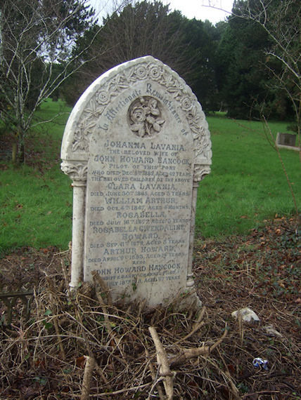 | Q657 | Private | Hancock | In Affectionate Remembrance of JOHANNA LAVANIA, the Beloved Wife of John Howard HANCOCK, pilot of this port, who died 5 December 1882 aged 42 years. The Beloved Children of the above, CLARA LAVANIA, died 30 June 1865 aged 3 years. WILLIAM ARTHUR, died 4 October 1867, aged 4 months. ROSABELLA, died 16 July 1877, aged 3 years. ROSABELLA GWENDALINE HOWARD died 11 September 1879, aged 3 years. ARTHUR HOWARD died 9 April 1883 aged 14 years. Also JOHN HOWARD HANCOCK, Cardiff & Barry Pilot, died 18 July 1911 aged 67 years. | 1867 |