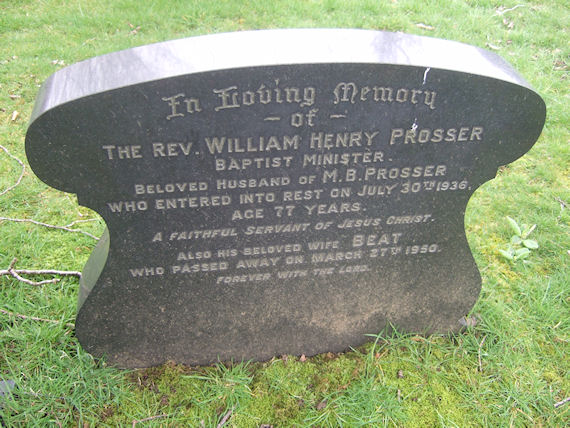 | T939 | Private | Turner | In Loving Memory of The Rev WILLIAM HENRY PROSSER, Baptist Minister, beloved husband of M B Prosser, who entered into rest on 30 July 1936, age 77 years. A faithful servant of Jesus Christ. Also his beloved wife BEAT, who passed away on 27 March 1959. Forever with the Lord. | 1936 |