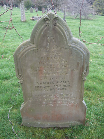 | T971 | Private | Camp | In Loving Memory of ELEANOR, beloved wife of Samuel CAMP who died 14 March 1932, aged 34 years. Also of above SAMUEL CAMP, died 29 June 1938, aged 90 years. Also of their children FANNY ELIZABETH [1884] & WALTER JAMES [1885], who died in infancy. For of such is the Kingdom of Heaven. | 1884 |