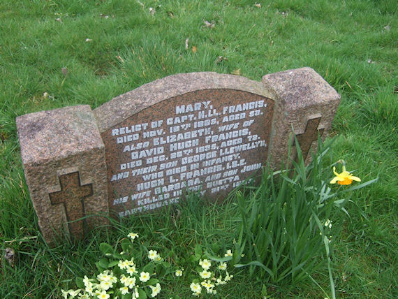 | T1165 | Private | Francis | MARY, Relict of Capt H LL FRANCIS, died 16 November 1885, aged 53. Also ELIZABETH, wife of David Hugh FRANCIS, died 26 December 1935, aged 72. And their son GEORGE LLEWELLYN, who died in infancy. HUGH L FRANCIS I.S.E. His wife BARBARA and son JOHN. killed in the Quetta Earthquake 31 May 1935. | 1885 |