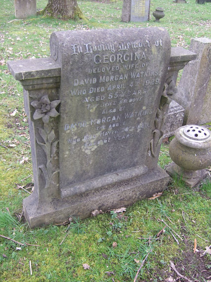 | W231 | Private | Watkins | In Loving Memory of GEORGINA, beloved wife of David Morgan WATKINS, who died 4 April 1929, aged 55 years. Thu will be done. Also of DAVID MORGAN WATKINS, the above, who died 20 May 1936 Aged 67 Years. | 1929 |
