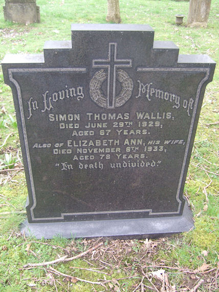 | W233 | Private | Wallis | In Loving Memory of SIMON THOMAS WALLIS, died 29 June 1929, aged 67 years. Also of ELIZABETH ANN, his wife, died 6 November 1933 aged 78 years. In Death Undvided. | 1929 |