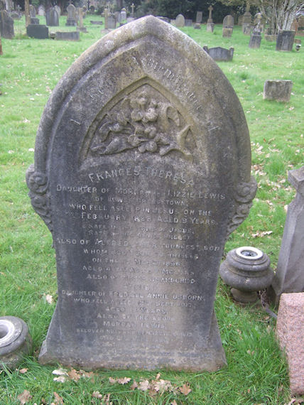 | W314 | Private | Lewis | In Loving Remembrance of FRANCES THERESA, daughter of Morgan & Lizzie LEWIS of Lower Grangetown, who fell asleep in Jesus on the 5 February 1888 aged 9 years. Safe in the arms of Jesus, safe on the gentle breast. Also of ALFRED their youngest son whom God took to himself on the 1 March 1896. Aged 4 years and 7 months. Also of their grandchild ANNIE daughter of Fred & Annie OSBORN who fell asleep 2 September 1917, aged 15 years. Also the above MORGAN LEWIS, beloved husband of Lizzie Lewis, died 10 June 1926, in his 73rd year. Also ELIZABETH eldest daughter died 17 August 1938 aged 65 years. | 1888 |