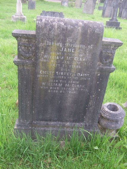 | W408 | Private | Clark | In Loving Memory of JANE, beloved wife of William M CLARK, who died 31 January 1933 aged 72 years. Also CICELY, SIDNEY & DAISY, infant children of the above. Also the above WILLIAM M CLARK who died 4 September 1942 age 80 years. | 1933 |
