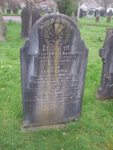 | W476 | Private | Lewis | In Loving Memory of ELIZABETH, daughter of Lewis & Ann LEWIS, who died 2 July 1891 aged 18 years. Thy will be done. Also LEWIS LEWIS, beloved husband of Ann Lewis and father of the above who died 23 October 1909 aged 72. Who so fearest the Lord, it shall be well with him at the last, and he shall find favour in the days of his death. Also ANN, mother & Relict of the above, who departed this life 28 December 1916, aged 79 years. Blessed are the dead which die in the Lord. | 1891 |