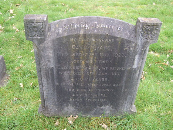 | W478 | Private | Evans | In Loving Memory of my dear husband DAVID EVANS, who died 23 November 1923 aged 68 years. Also ELIZABETH ANN his beloved wife who died 6 January 1931, aged 71 years. Also SUSIE their loved baby who died in infancy 4 July 1891. Never Forgotten. | 1891 |
