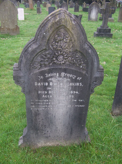 | W500 | Private | Jenkins | In Loving Memory of DAVID OWEN JENKINS (of Louisa Street) Died 13 December 1896, aged 35 years. He weakened my strength by the way, he shortened my days, Gostyngodd efe fy nerth ar y ffordd byrhaodd fy nyddiau. | 1896 |