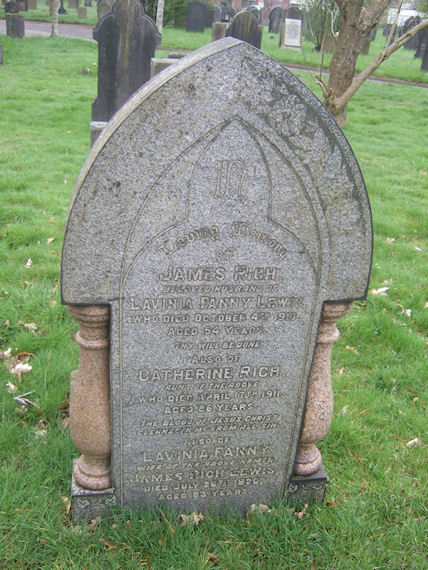 | W553 | Private | Lewis | In Loving Memory of JAMES RICH, beloved husband of Lavinia Fanny LEWIS who died 4 October 1910, aged 54 years. Thy Will be Done. Also of CATHERINE RICH aunt of the above who died 17 April 1911 aged 86 years. Also of LAVINIA FANNY wife of the above named James Rich LEWIS, died 26 July 1920, aged 63 years. | 1910 |