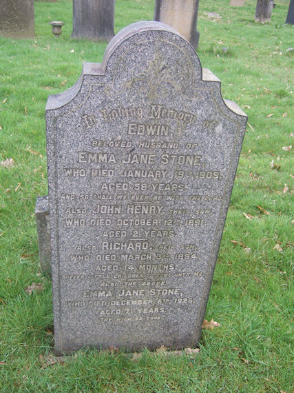 | W602 | Private | Stone | In Loving Memory of EDWIN beloved husband of Emma Jane STONE who died 19 January 1909 aged 58 years. And so shall we ever be with the Lord. Also JOHN HENRY, their son, who died 12 October 1891 aged 2 years. Also RICHARD, their son , who died 3 March 1894 aged 14 months. Suffer little children, come unto me. Also EMMA JANE STONE, who died 6 December 1925 aged 71 years. Thy will be done. | 1891 |