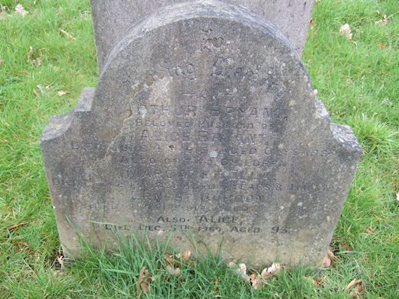 | W603 | Private | Bryant | In Loving Memory of ARTHUR BRYANT, beloved husband of Alice Bryant, died 4 June 1915 aged 61 years. Also of the children MARGARET ELLA died 24 October 1891 aged 3 years 1 month. ERNEST GORDON died 1 June 1914 aged 7. Also ALICE died 5 December 1959 aged 93. | 1891 |