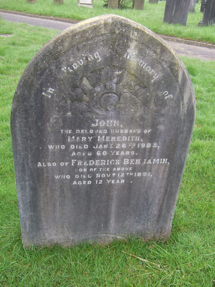 | W649 | Private | Meredith | In Loving Memory of JOHN the beloved husband of Mary MEREDITH, who died 26 January 1903, aged 60 years. Also of FREDERICK BENJAMIN, son of the above, who died 12 November 1891, aged 12 years. | 1891 |