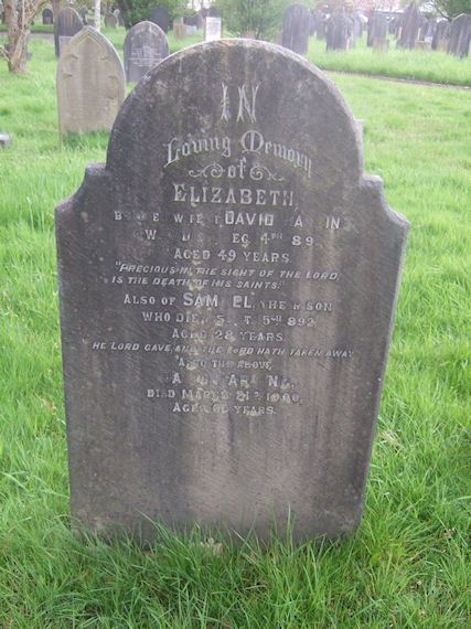 | W676 | Private | Harding | In Loving Memory of ELIZABETH, beloved wife of David HARDING, who died 4 December 1891 aged 49 years. Precious in the sight of the Loed, is the death of his saints. Also of SAMUEL, their son, who died 15 September 1892 aged 28 years. The Lord gave and the Loed hath taken away. Also the above DAVID HARDING, died 21 March 190 aged 65 years. | 1891 |