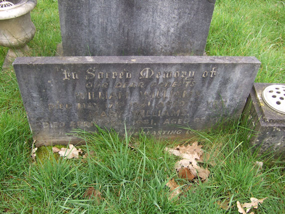 | W741 | Private | Williams | In Sacred Memory of our dear parents WILLIAM WILLIAMS died 17 May 1941 aged 75 years. MARY WILLIAMS died 29 April 1961 aged 95 years. ... Everlasting Love. | 1941 |