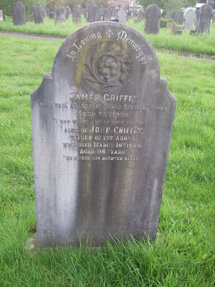 | W785 | Private | Griffey | In Loving Memory of JAMES GRIFFEY, who fell asleep in Jesus, 7 April 1892, aged 43 years. I was weary and he gave me rest. Also of JOHN GRIFFEY, father of the above, who died 16 March 1908, aged 96 years. He giveth his beloved sleep. | 1892 |