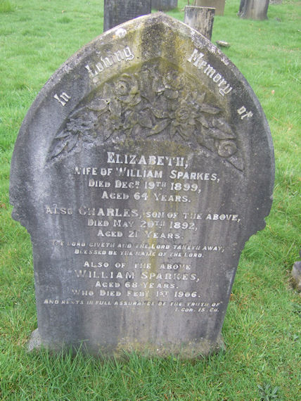 | W825 | Private | Sparkes | In Loving memory of ELIZABETH, wife of William SPARKES, died 19 December 1899 aged 64 years. Also CHARLES, son of above, died 20 May 1892 aged 21 years. The Lord giveth and the Lord taketh away, blessed be the name of the Lord. Also of the above, WILLIAM SPARKES aged 68 years who died 1 February 1906. And rests in full assurance of the the truth of 1 COR 15 CH. | 1892 |