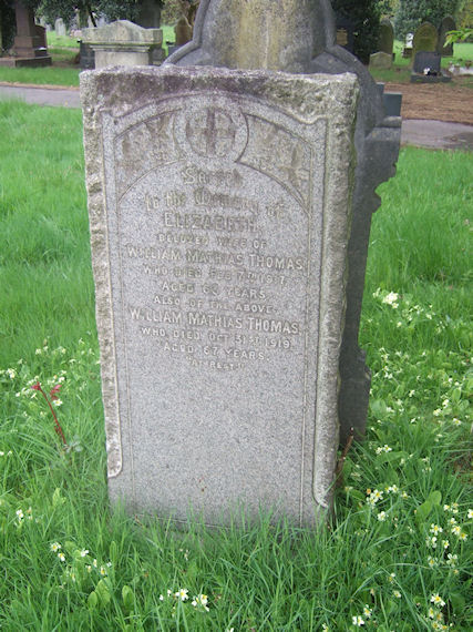 | W959 | Private | Thomas | Sacred to the Memory of ELIZABETH, beloved wife of William Mathias THOMAS, who died 7 February 1917 aged 63. Also the above WILLIAM MATHIAS THOMAS who died 31 October 1919. Aged 67 years. At Rest. | 1917 |