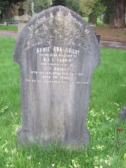 | W978 | Private | Knight | In Loving Memory of ANNIE ADA KNIGHT the beloved daughter of A & S HARRIS and loving wife of H H Knight who passed away 24 February 1917, aged 26 years. The Day was never dull when she was near. | 1917 |