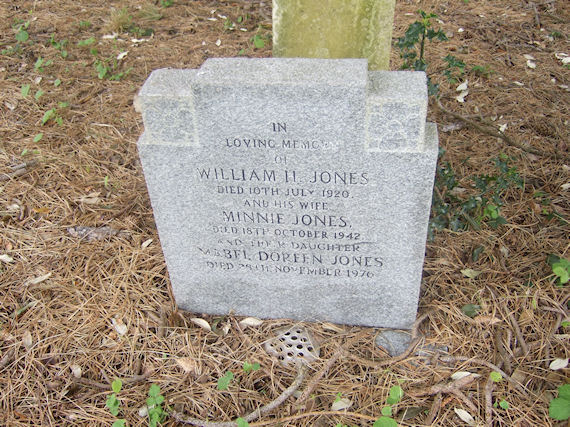 | W1167 | Private | Jones | In Loving memory of WILLIAM H JONES, died 10 July 1920, And his wife MINNIE JONES, died 18 October 1942 And their daughter MABEL DOREEN JONES, died 28 November 1976. | 1920 |