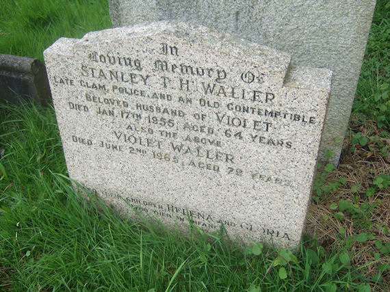 | W1215 | Private | Waller | In Loving memory of STANLEY T H WALLER, Late Glam Police and an old Contemptible. Beloved husband of VIOLET died 17 January 1955, aged 64 years. Also the above VIOLET WALLER, died 2 June 1965 aged 72 years. Also their children HELENA and GLORIA, who died in Infancy. | 1955 |