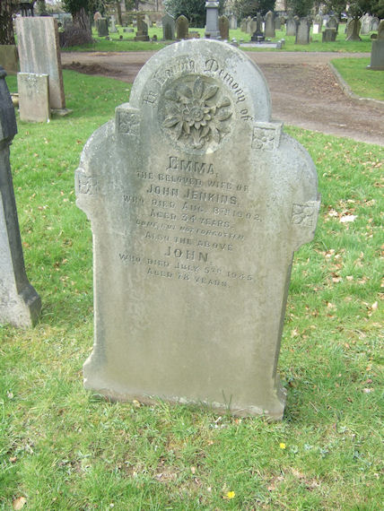 | Y160 | Private | Jenkins | In Loving Memory of EMMA, the beloved wife of JOHN JENKINS, who died 8 August 1902, aged 34 years. Gone, but not forgotten. Also the above JOHN, who died 5 July 1945, aged 78 years. | 1902 |