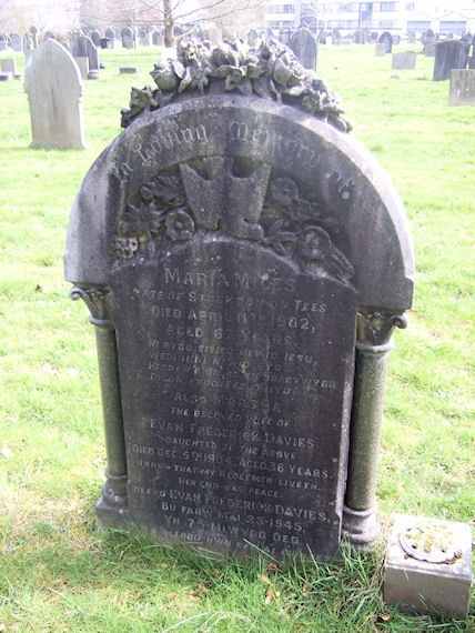 | Y276 | Private | Davies | In Loving Memory of MARIA MILES, late of Stockton on Tees, died 11 April 1902, aged 67 years. Ni bydd eisieu newid Iesu, wedi inni newidgbyd. Heddyw'r un. ac in dracywydd, digon fyddiere, o hyd. Also MARTHA the beloved wife of Evan Frederick DAVIES, daughter of the above, died 5 December 1904, aged 36 years. I know that my redeemer liveth. Her end was peace. Hefyd EVAN FREDERICK DAVIES, bu farw 25 May 1945, yn 75 mlwydd oed. Nin a allodd hwn efe at gwnaeth. | 1902 |