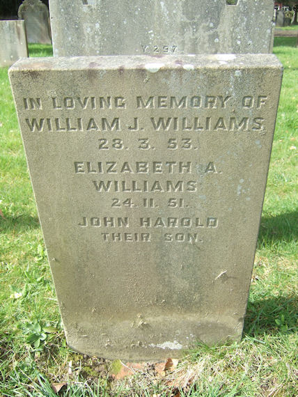 | Y298 | Removed | Williams | In affectionate Remembrance of WILLIAM J. WILLIAMS, died March 28th 1953 aged 74 years. In loving memory of ELIZABETH ANN beloved wife of William J. WILLIAMS, died Nov. 24th 1951 aged 74 years. Also their son JOHN HAROLD died in infancy. | 1902 |