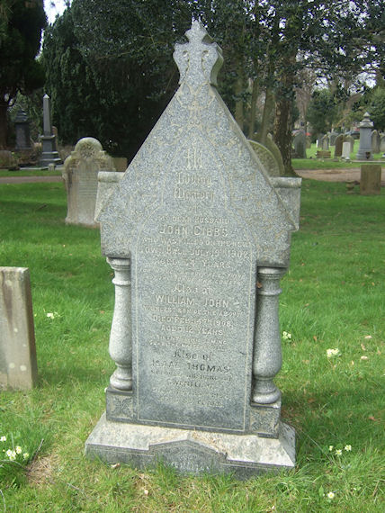 | Y317 | Private | Gibbs | In Loving Memory of my dear husband, JOHN GIBBS, who was killed on the new Town Hall 15 July 1902, aged 34 years. For in such an hour as ye think not the son of Man cometh. Also of WILLIAM JOHN, youngest son of the above, died 14 February 1908, aged 12 years. Silent is his coming, sure the Master calls. Also of ISAAC THOMAS, beloved husband of Gwenllian died 25 November 1956 aged 83 years. Also GWENLLIAN ... | 1902 |