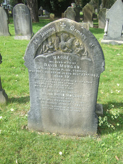 | Y340 | Private | Morgan | In Loving Memory of RACHEL beloved wife of David MORGAN, 3 Senghenydd Place, Cardiff, who fell asleep in Jesus 23 December 1902, aged 53. Hithau ddiangodd weithian-o'i gwendid i geinder nef lydan; Yno mae hi'n ei hanian - aelod o gor gwlad y gan. Also of the above Major DAVID MORGAN, Salvation Army, who was promoted to glory on Sunday 17 June 1923. Watch ye standfast in the faith, quit you like men, be strong. | 1902 |