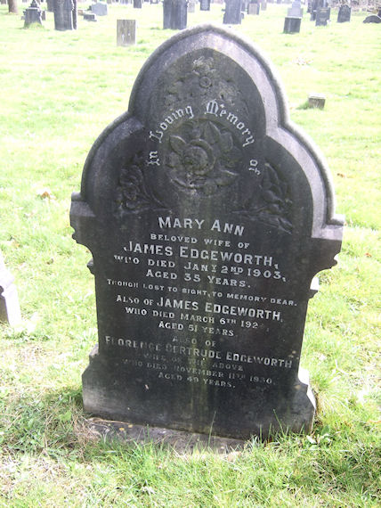 | Y360 | Private | Edgeworth | In Loving Memory of MARY ANN beloved wife of James EDGEWORTH who died 2 January 1903 aged 35 years. Though lost to sight, to memory dear. Also of JAMES EDGEWORTH, who died 6 March 1924, aged 51 years. Also of FLORENCE GERTRUDE EDGEWORTH wife of the above, who died 11 November 1930, aged 49 years. | 1903 |
