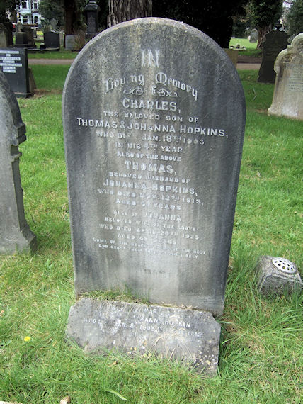| Y379 | Private | Hopkins | In Loving Memory of CHARLES, the beloved son of Thomas & Johanna HOPKINS, who died 18 January 1903 in his 4th year. Also of the above THOMAS, beloved husband of Johanna HOPKINS, who died 12 November 1913, aged 61 years. Also of JOHANNA, beloved wife of the above, who died 20 April 1925, aged 69 years. Some of the dearest, some of the best. God grant them thine eternal rest. | 1903 |