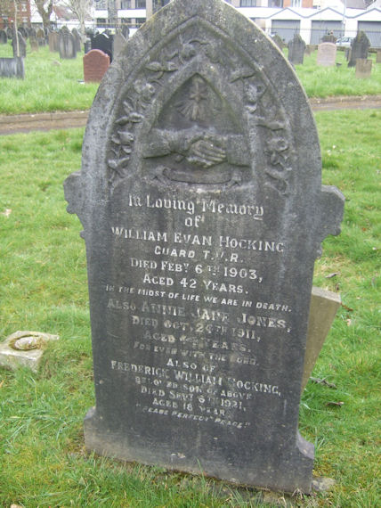 | Y396 | Private | Hocking | In Loving Memory of WILLIAM EVAN HOCKING Guard TVR died 6 February 1903 aged 42 years. In the midst of life we are in death. Also ANNIE JANE JONES died 24 October 1911 aged 44 years. For ever with the Lord. Also FREDERICK WILLIAM HOCKING beloved son of the above died 6 September 1921 aged 18 years. Peace Perfect Peace. | 1903 |