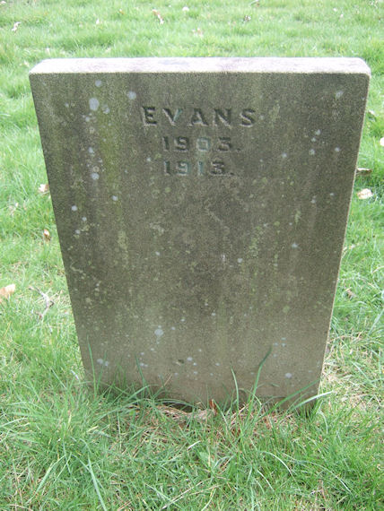 | Y434 | Removed | Evans | In loving memory of WILLIAM HUGH EVANS who died January 21st 1903 aged 45 Also of MARY JANE beloved wife of the above who died Dec. 20th 1913 aged 56 years. "Until the day breaks and the shadows flee away". | 1903 |