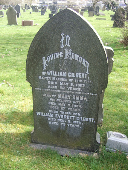 | Y486 | Private | Gilbert | In Loving Memory of WILLIAM GILBERT, Master Mariner of this Port, died 8 May 1903, aged 52 years. From loves shining circle the gem drops away. Also of MARY EMMA, his beloved wife, died 2 May 1924, aged 67 years. Also their son WILLIAM EVERETT GILBERT, died 8 December 1955, aged 73 years. | 1903 |