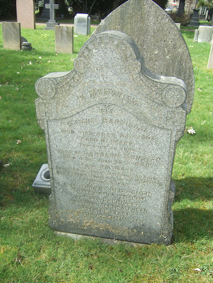 | Y487 | Private | Barnicoat | In Memoriam SAMUEL BARNICOAT, who died 24 April 1903, aged 61 years. Thy Will be Done. Also of CAROLINE DUNSTAN who died 18 July 1908, aged 85 years. Trusting in Jesus, the Rock of Ages, she passed from earth to heaven's perfect peace. Also of MARY ELIZABETH, beloved wife of the above, Samuel BARNICOAT, who died 3 March 1931, aged 88 years. Safe in heaven's perfect peace. | 1903 |