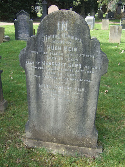 | Y532 | Private | Reid | In Loving memory of HUGH REID, who fell asleep 25 June 1903, aged 70 years. Also of MARGARET KERR, his wife, who fell asleep 23 August 1906, aged 72 years. Heirs together of the grace of life. Also of MARY WATSON REID, daughter of the above, died 18 April 1942, aged 79 years. | 1903 |