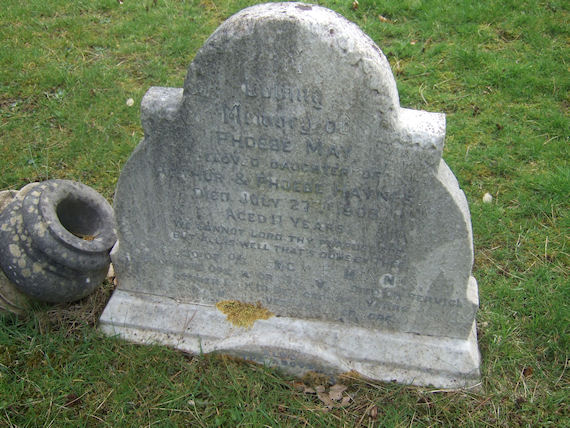 | Y557 | Private | Haynes | In Loving Memory of PHOEBE MAY, beloved daughter of Arthur & Phoebe HAYNES died 27 July 1903, aged 11 years. We cannot Lord thy purpose see but all is well thats done by thee. Also of O/S PERCY F[INNEMORE] HAYNES hydrophone operator RNVR died on service 10 October 1918 aged 18 years. ... | 1903 |