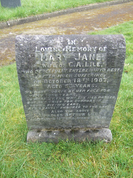 | Y690 | Private | Lile | In Loving Memory of MARY JANE wife of C A LILE, who peacefully entered into rest after much suffering on 18 October 1907, aged 53 years. We have looked at her face for many long years, so worn by the way she had passed, but she cried for support in loves pitying ears, and bravely endured to the last. Also the above CHARLES ARTHUR LILE who died 12 March 1918 aged 67 years. | 1907 |