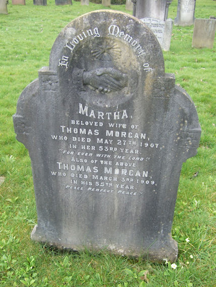 | Y711 | Private | Morgan | In Loving Memory of MARTHA, beloved wife of Thomas MORGAN, who died 27 May 1907, in her 53rd year. For Ever with the Lord. Also of the above THOMAS MORGAN, who died 3 March 1909 in his 55th year. Peace, Perfect, Peace. | 1907 |